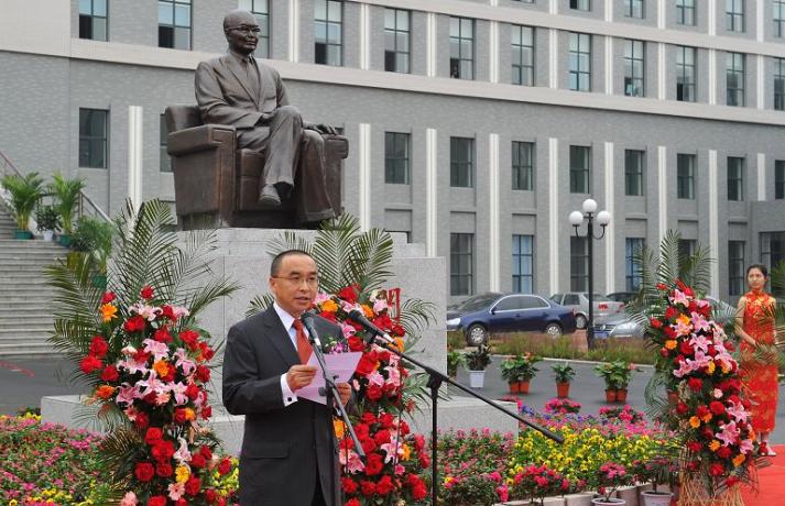 虽然天降细雨,但是8点左右,参加仪式的人员已经陆续到场,匡亚明楼前人头攒动。8时30分,仪式正式开始,党委书记陈德文和校长展涛共同为匡亚明楼揭幕,当巨大的红幕从匡亚明楼上缓缓滑落的时候,在场所有人鼓掌并持续良久。在刚刚揭幕的匡亚明楼前,匡亚明之子匡榕榕先生、校长展涛为匡亚明先生塑像揭幕,全体人员向塑像鞠躬致敬,并由学生代表为匡亚明塑像敬献花篮,以表达吉大人对匡亚明先生的缅怀与崇敬。