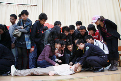 本次培训分为上午的礼仪培训和下午的急救培训。礼仪培训不仅向同学们介绍了志愿者服务过程中应注意的礼仪,还介绍了大学生日常生活中的礼仪,在轻松愉快的氛围下同学们也学习到了关于接打电话、接递名片等待人接物的礼仪知识,站姿、坐姿、走姿、蹲姿、握手、表情等具体礼仪规范以及简单的导游礼仪,培训还为同学们详细讲解了男、女同学在不同场合适宜的着装打扮,并专门为女同学介绍了化彩妆等细节问题。一位同学向记者表示,此次培训让他受益匪浅,以前还真不知道言谈举止中有这么多规矩需要遵守,以后一定会好好“按规办事”,力争为“挑战杯”大赛提供优质高效的志愿服务。